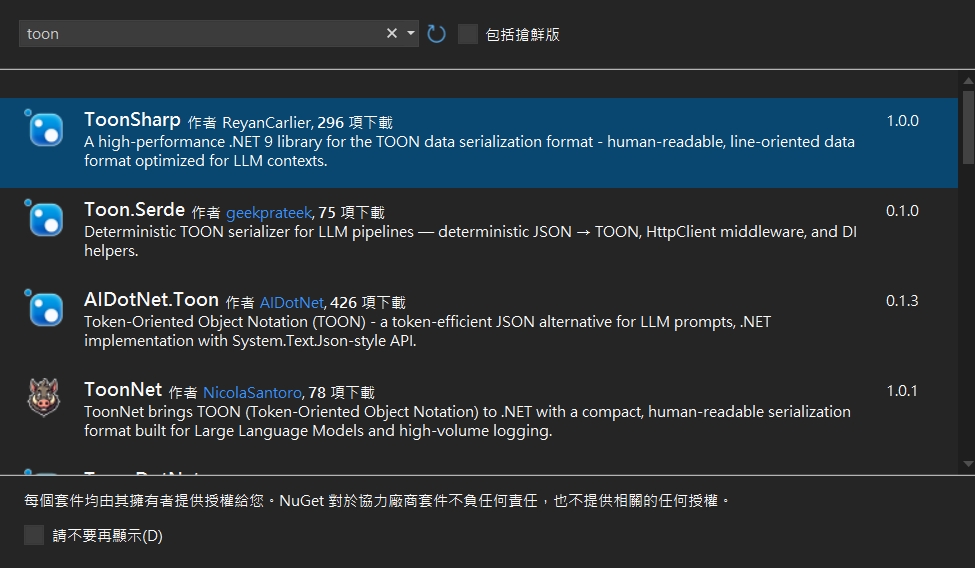 這邊我使用的是 ToonSharp 做序列化 ,這一套目前看起來是有在維護的而且他目前就支持 .Net 9 以上
