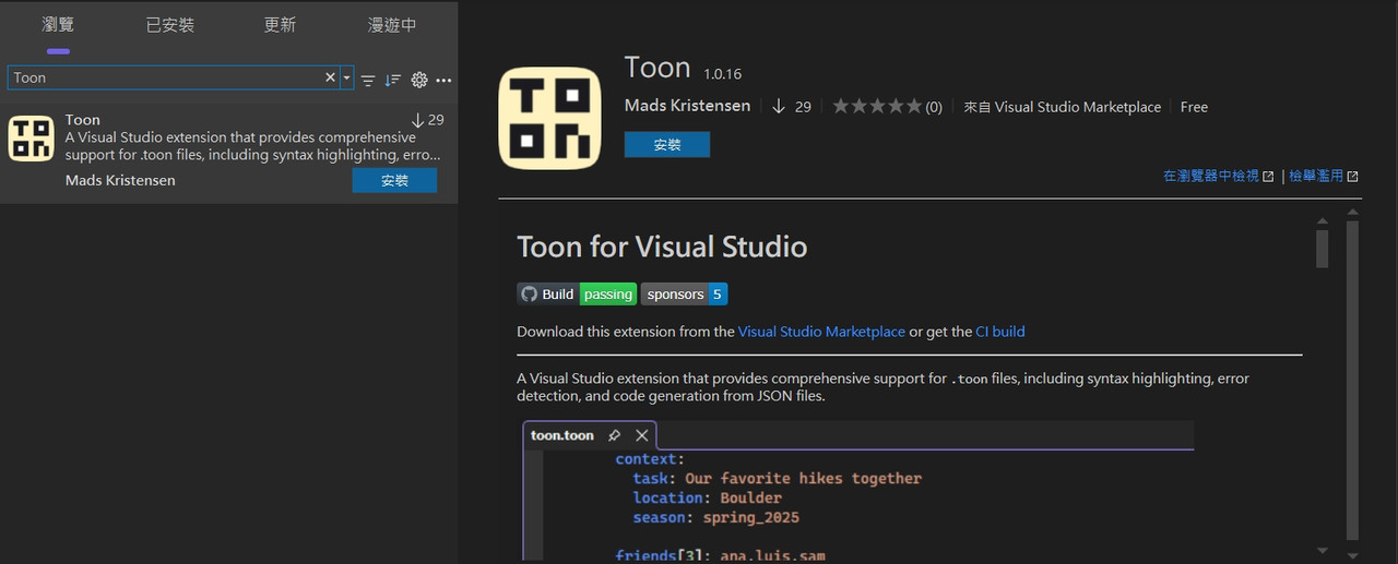 今天剛好看到一個 Visual Studio 的擴充套件 可以直接開啟 TOON 格式